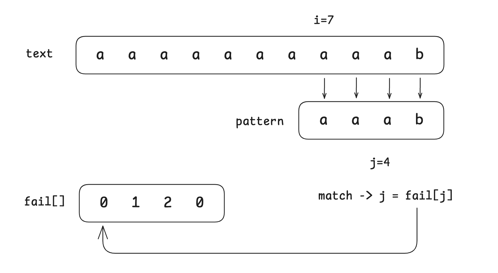 단, 동일한 두 패턴을 비교하는 것이 아닌 $\sum\limits_{i=1}^{M-1} P_i$와 $\sum\limits_{j=0}^{M-1} P_j$를 비교하면서 $P_i$에 대해 $j$를 fail[] 배열을 통해 변경하고 각 $state_i$에 대한 fail[i] 값을 계산하는 것이죠.