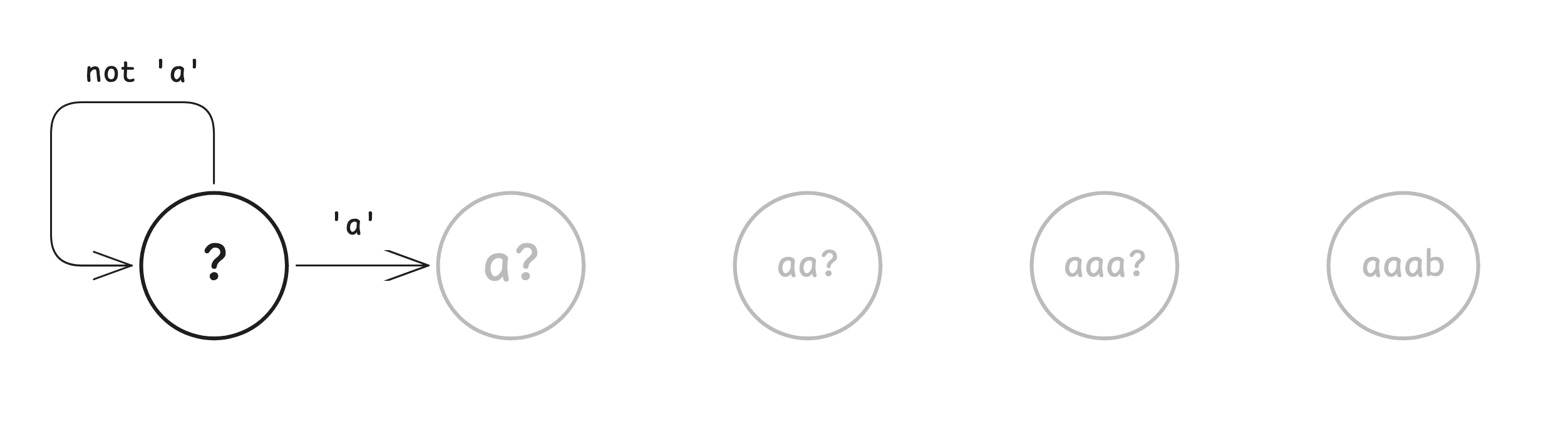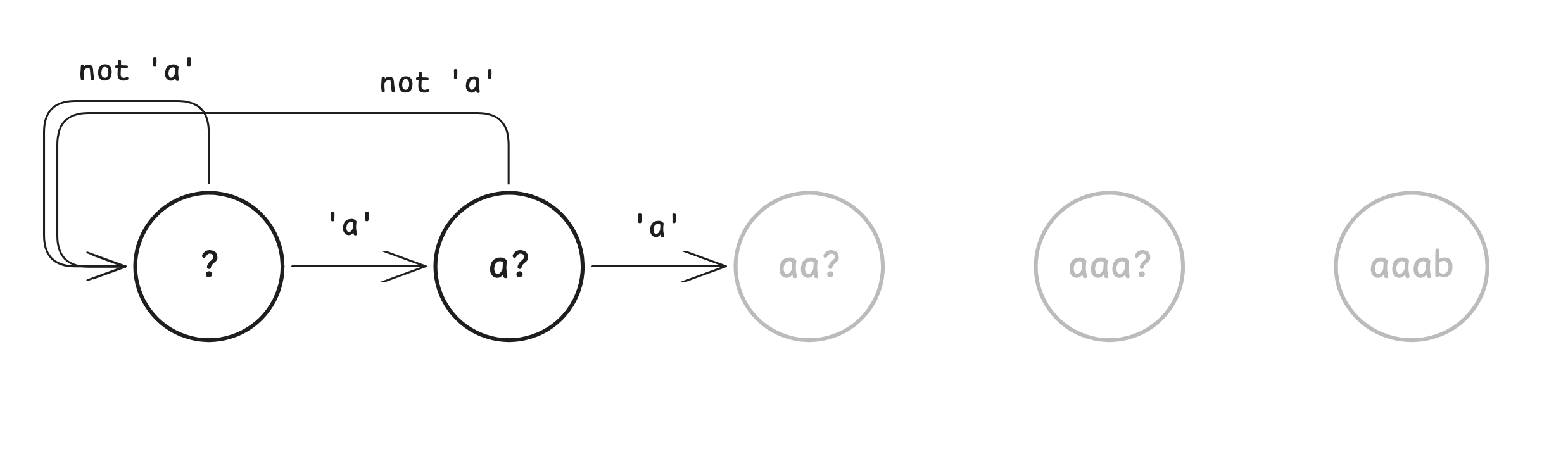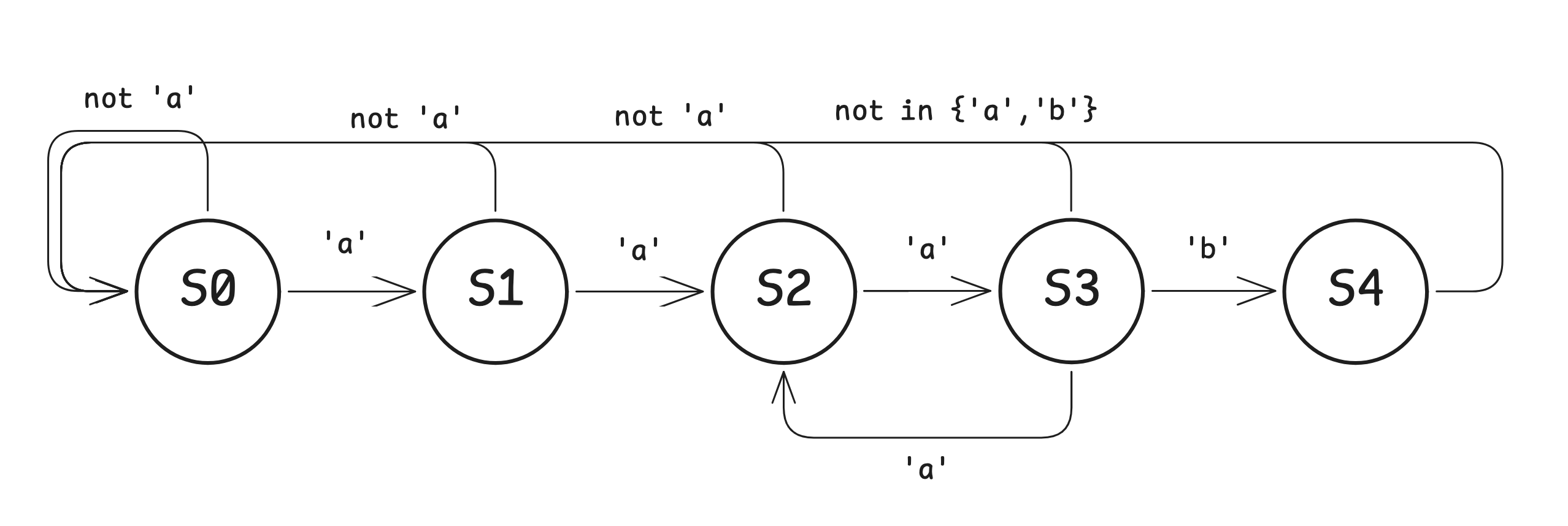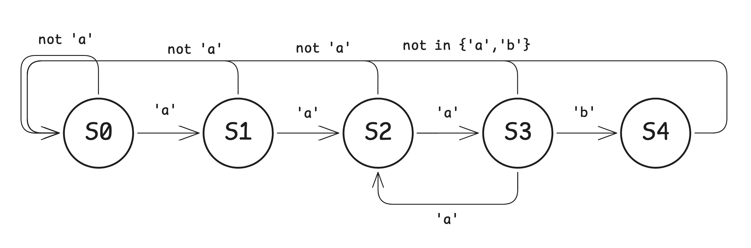이전과 마찬가지로 저희에겐 지금 비교하는 문자 ($T_{i+1}$)가 $a$냐 아니냐만이 중요합니다. 비교하는 문자가 $a$라면 다음으로 넘어가 세 번째 문자와 비교를, 그렇지 않다면 다시 첫 번째 문자부터 비교하면 되기 때문입니다.