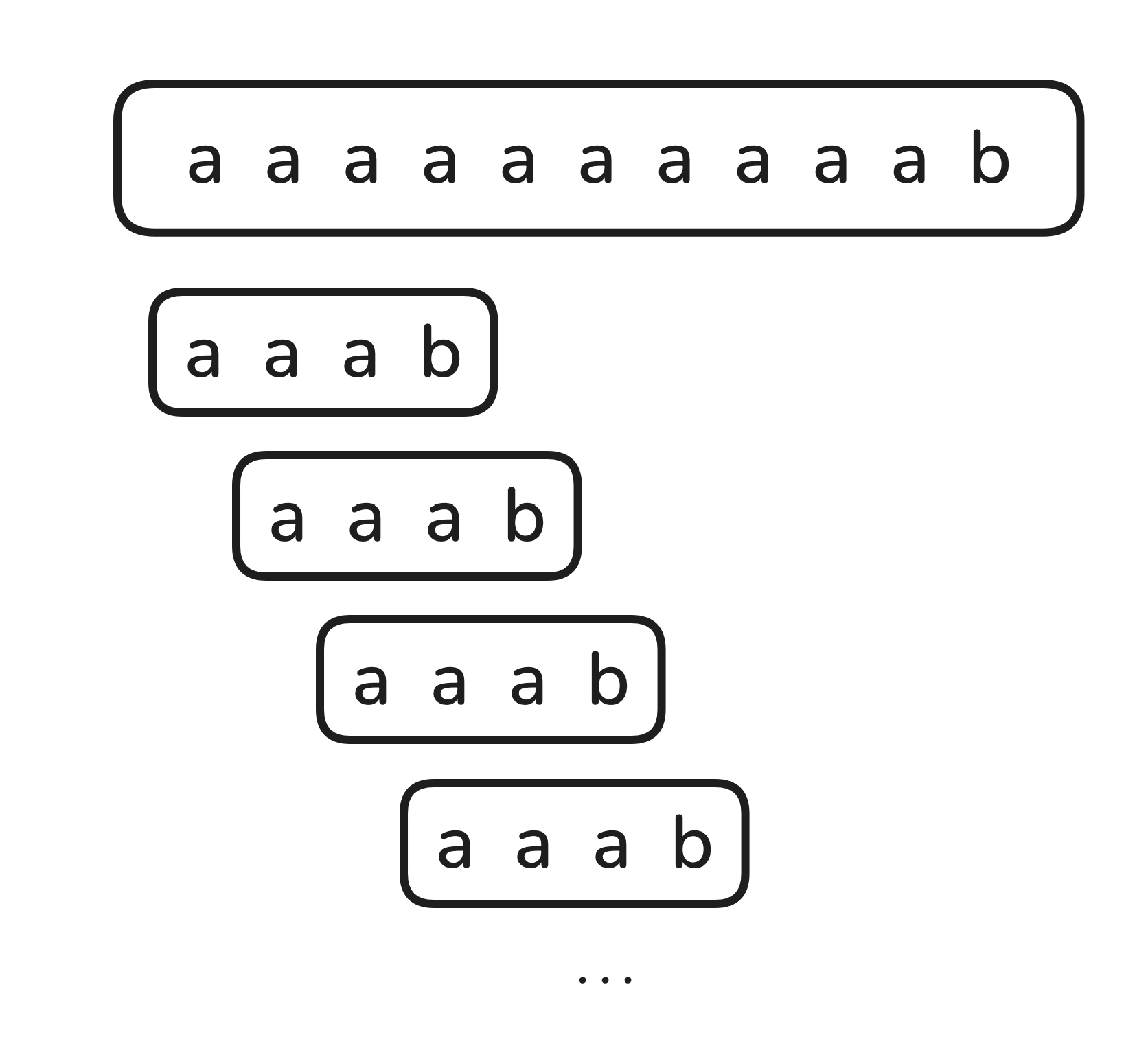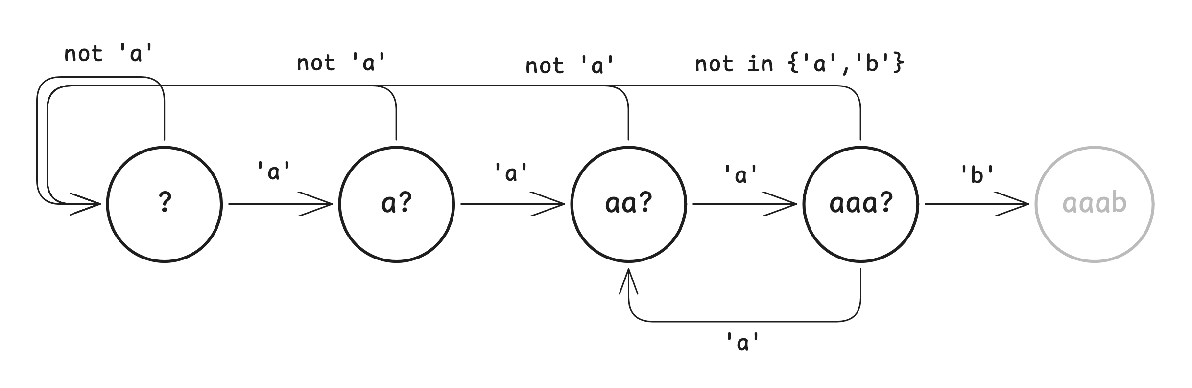 다음으로 $a$일 때는 어떻게 될까요? 현재까지 확인한 텍스트가 $aaaa$라는 뜻이므로 다음에 비교할 텍스트 문자를 다시 패턴의 네 번째 문자와 비교하면 됩니다. 패턴의 첫 번째 문자부터 세 번째 문자까지 $aaa$를 만족하는 것은 동일하므로 처음부터 다시 비교할 필요가 없다는 것이죠.