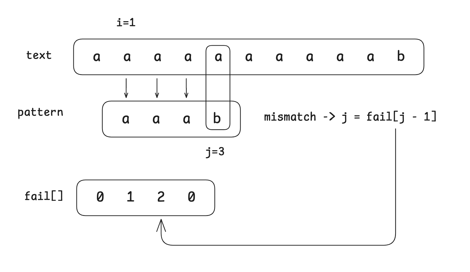 인덱스 $j$가 fail[] 배열을 통해 2로 재할당이 되지만 기존에 알고 있는 텍스트 $aaaa$가 패턴 $aaa$와 일치하기 때문에 $i=1, j=3$로 다시 비교를 시작하게 됩니다.
