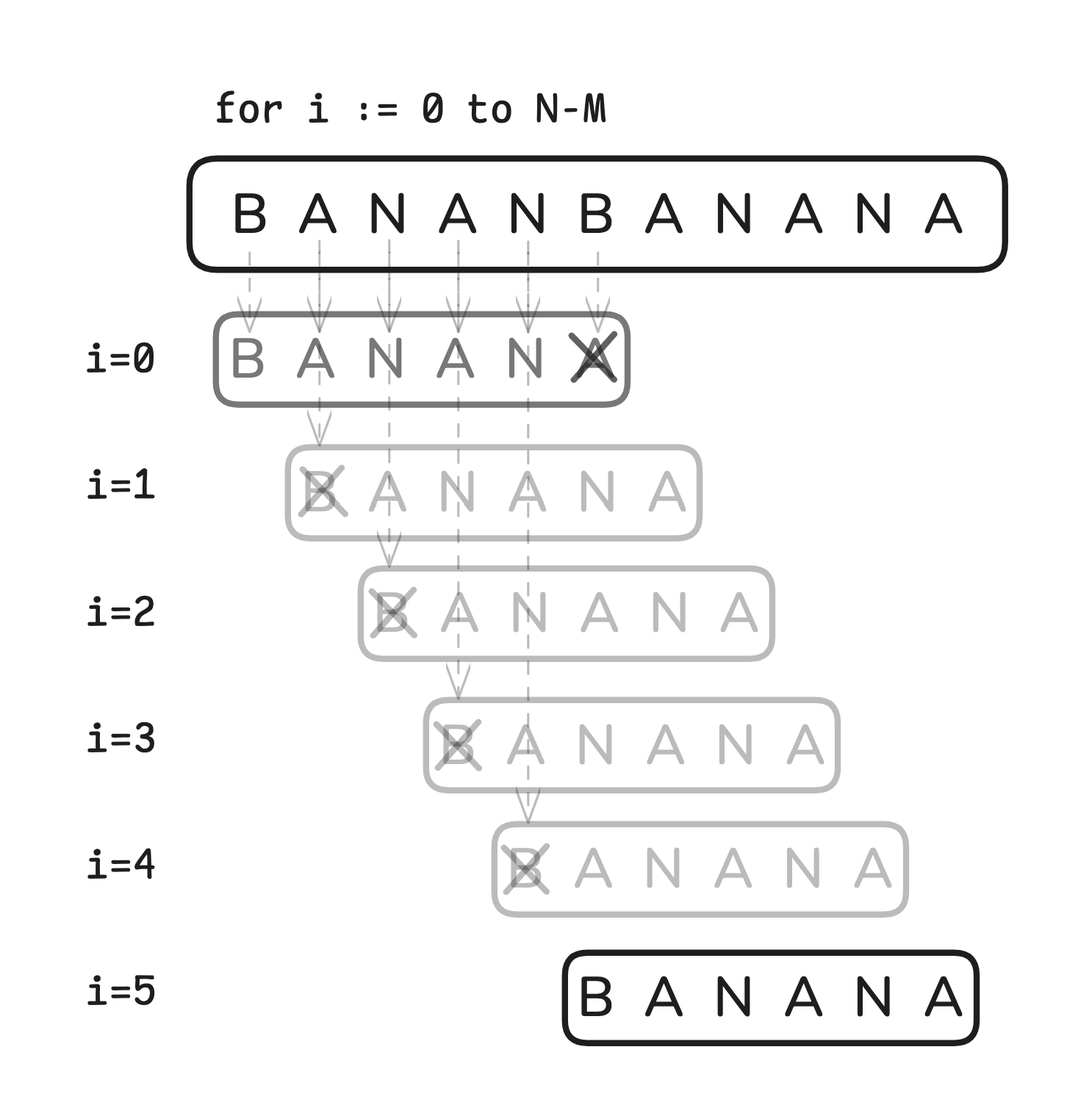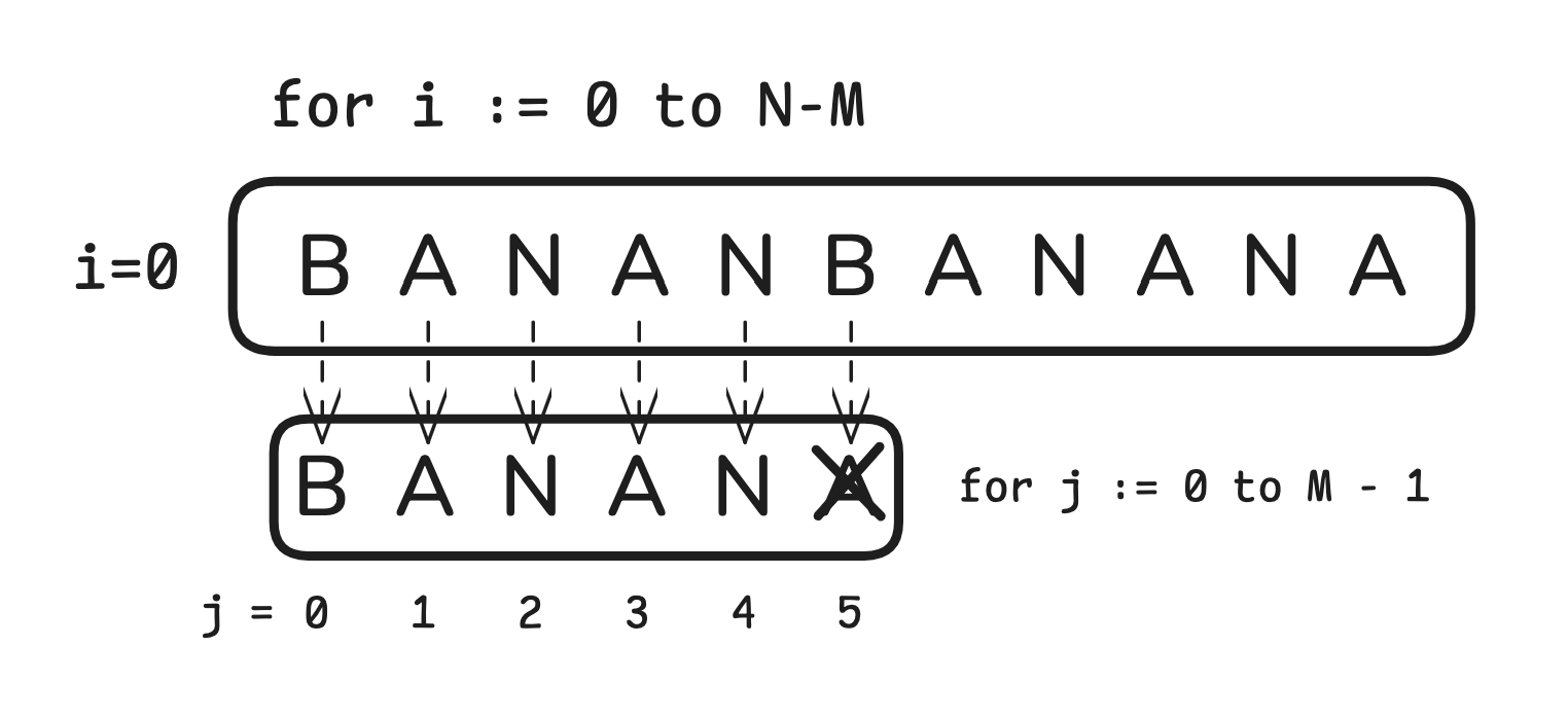 반복문을 Nested 하게 사용하면서 주먹구구식으로 가능한 모든 위치에서 패턴의 등장 여부를 판단하기 때문에 Brute-Force 알고리즘이라고도 할 수 있죠.